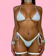 Mini tri top ties around neck and back. High rise thong ties at each hip. Set is covered in 3mm crystals.
