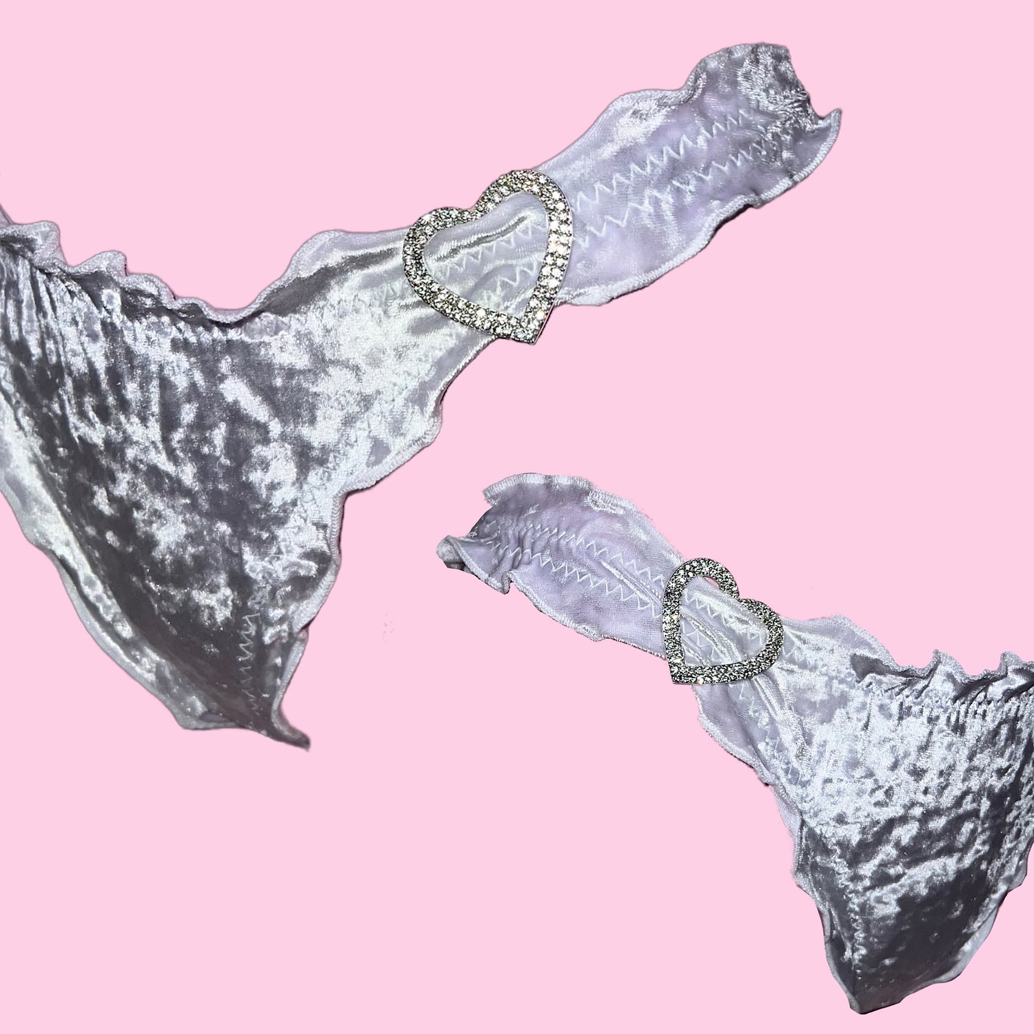 THONG features ruched trim and short sleeves which can be positioned to sit on or to sides of your shoulders. Brilliant sparkly diamond heart charm in middle is about . Long frilly ties around back so it's easy to take on and off on stage!