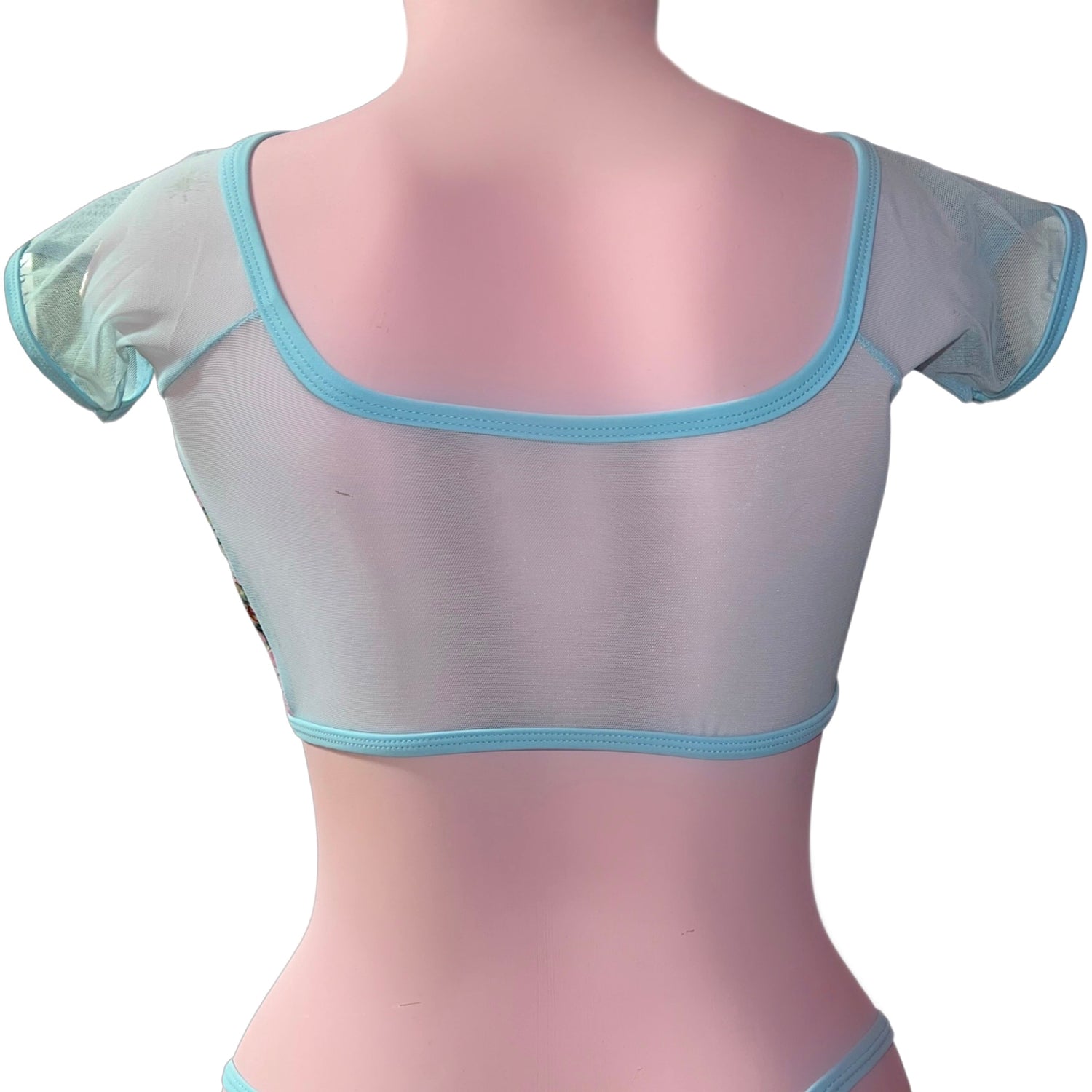 Short sleeve top features mesh back & sleeves, and ties in front. V back thong is lined.